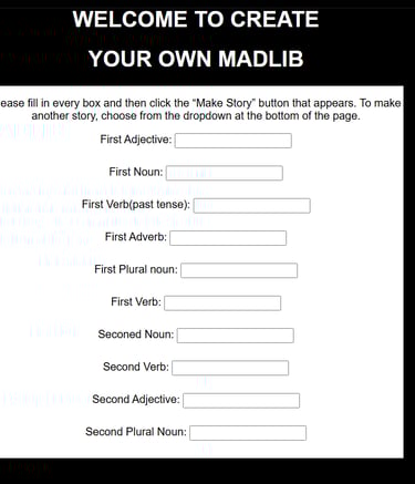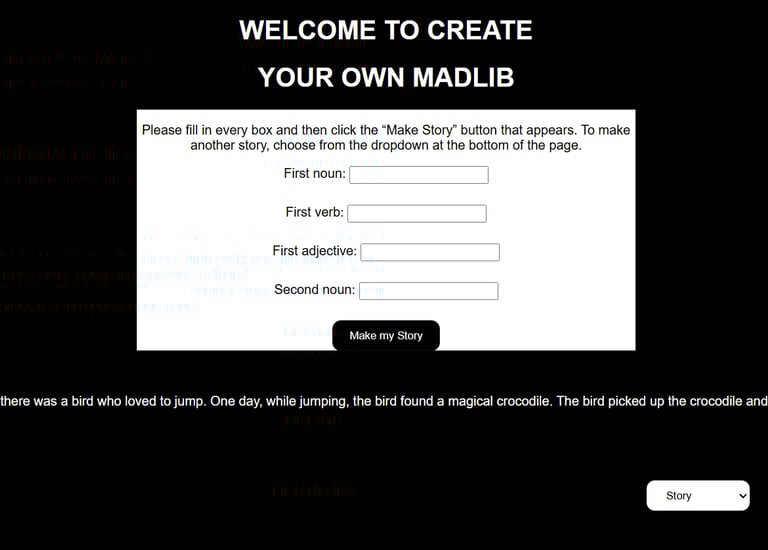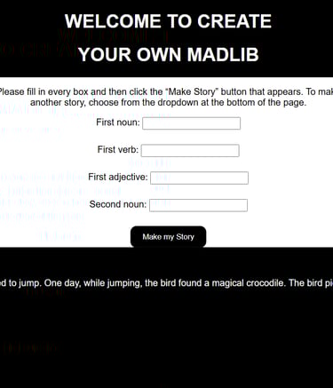 JavaScript web based application that allows users to create their own story by adding random verbs, nouns and adjectives.